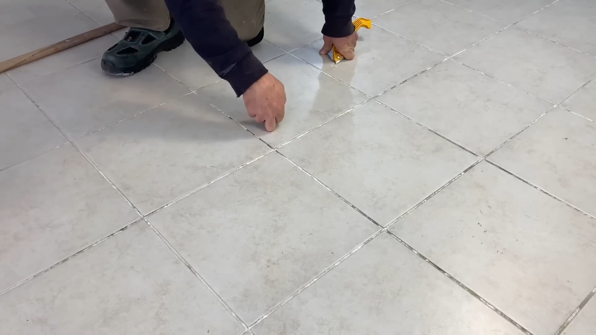 Далее при помощи монтажного ножа, по периметру каждой плитки, необходимо удалить затирку.