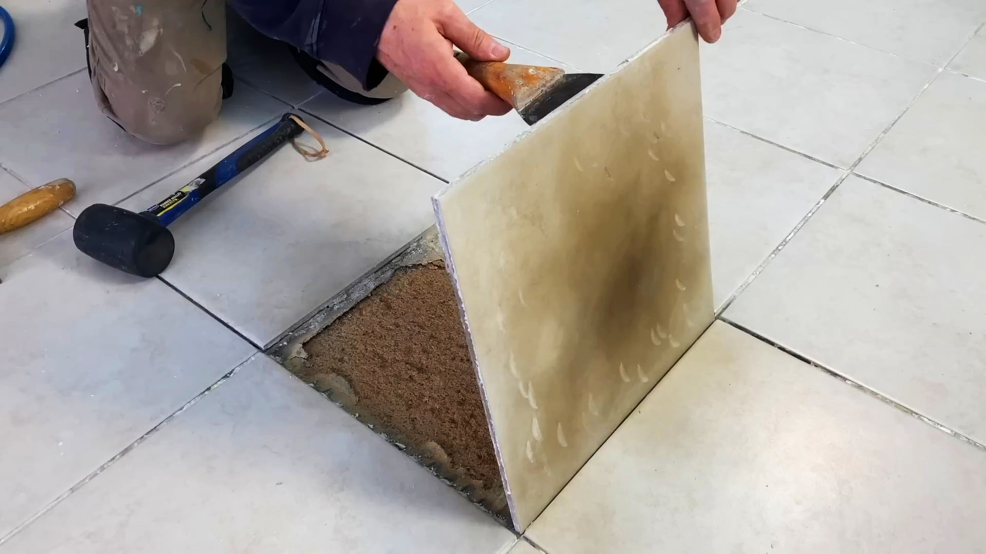 Резиновой киянкой простукиваем всю поверхность, чтобы разрушить остатки клея под плиткой.