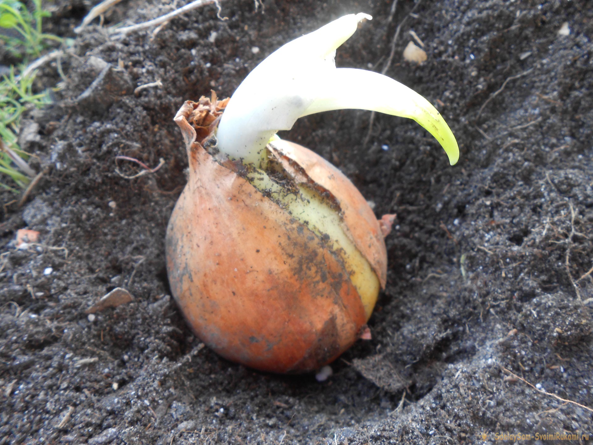 Кроме проросших головок лука на посадку можно использовать и лук-севок. А для ускорения процессов пробуждения верхушки севка срезают параллельно к донцу, снимая примерно 2 мм. Естественно, что из семян формируются более тонкие побеги, чем из репчатого лука.